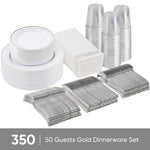 - 🍽️Complete Party Set: This 350-piece disposable plastic cutlery set serves 50 guests, including 10.25" dinner plates, 7.5" salad plates, and gold plastic utensils.