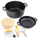 Pre-seasoned 6.5QT Cast Iron Dutch Oven with a silicone bread proofing basket, brush, dough scraper, bread lame, and Danish dough whisk. Made with 100% natural vegetable oil, free from synthetic coatings. Ideal for searing, sautéing, braising, roasting, baking, and grilling. The lid doubles as a skillet, allowing you to cook two dishes at once. Works with gas, electric, ceramic, and induction cooktops, and is oven-safe up to 500°F. Easy to clean and maintain with natural oils. Perfect for bread baking, stews, and hearty meals. A great gift for baking enthusiasts and home cooks alike.