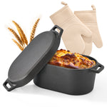 Hawsaiy 4.5QT Oval Cast Iron Dutch Oven with Skillet Lid, Plant Oil Coating, Nonstick Bread Baking Pot with Silicone & Cotton Oven Mitts, 2-in-1 Casserole for Baking, Stewing & Frying