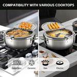- 🍟High-Quality Material: Crafted from durable 304 stainless steel, this deep fryer pot withstands high heat and ensures even heat distribution. Compatible with all cooktops, including induction, electric stoves, and gas.